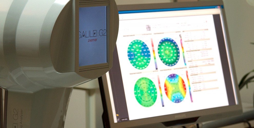 Sistema de tomografia corneana de alta precisão que utiliza duas câmeras de Scheimpflug e análise tridimensional de segmento anterior, combinando as vantagens de duas tecnologias: imagens de Plácido para curvaturas e de Scheimpflug para elevações.
